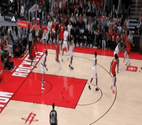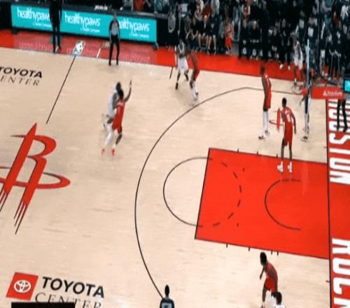 哈登和加雷特二人转后,喂梅里尔远射。上半场末尾,梅里尔快下接传球,和跟进的哈登一个二人传接,远射。
