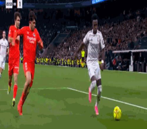 第44分钟,维尼修斯突破虚晃后射门,被皇家社会后卫挡出